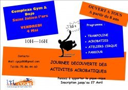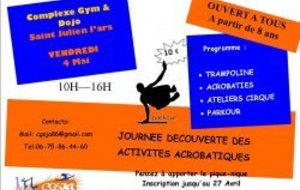 Le vendredi 4 mai de 10h à 16h au complexe gym et dojo de St Julien l'Ars, le club organise sa 2ème journée de découvertes des activités acrobatiques.